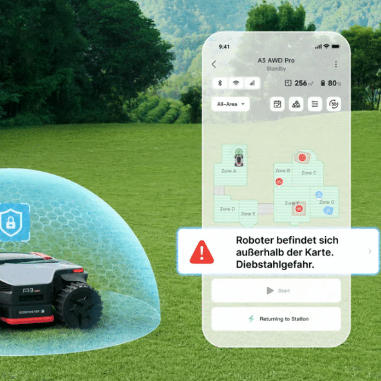 Zusätzliche Sicherheitsfunktionen wie Anhebewarnung, 4G-Verbindung und AirTag-Kompatibilität erhöhen den Diebstahlschutz und sorgen für maximale Sicherheit – selbst im unbeaufsichtigten Betrieb.
